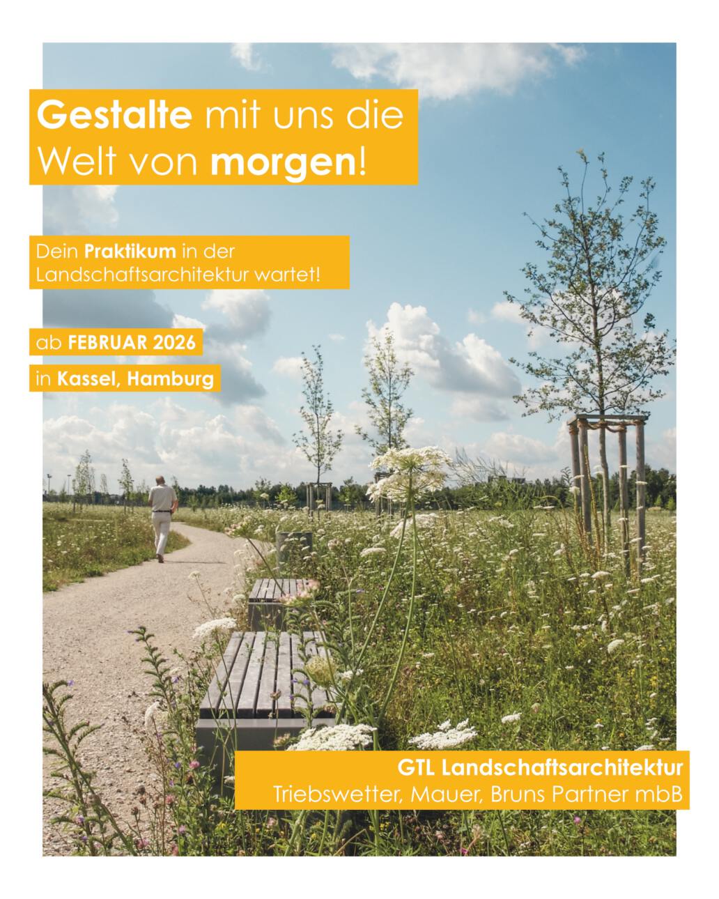 Wir suchen zur Unterstützung unseres Teams für die Standorte Kassel und Hamburg ab Februar 2026 Praktikant*innen in der Landschaftsarchitektur/Freiraumplanung. Die Praktikumsdauer sollte mindestens vier Monate betragen.