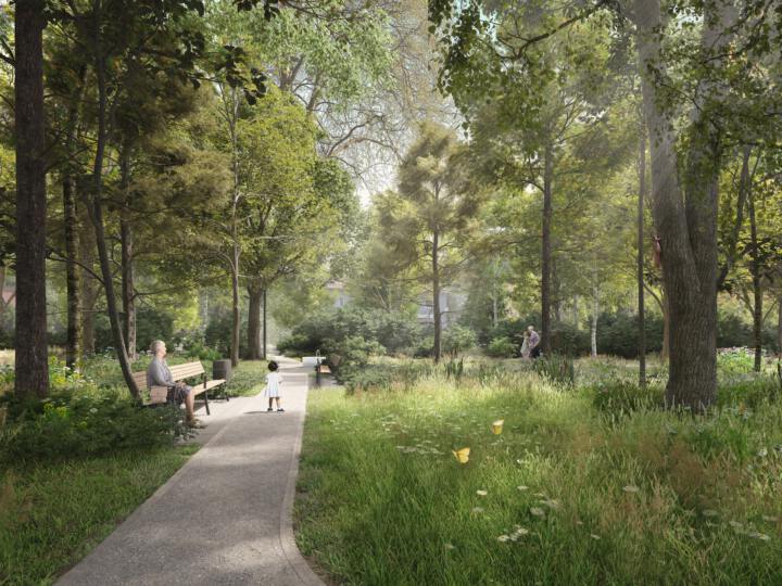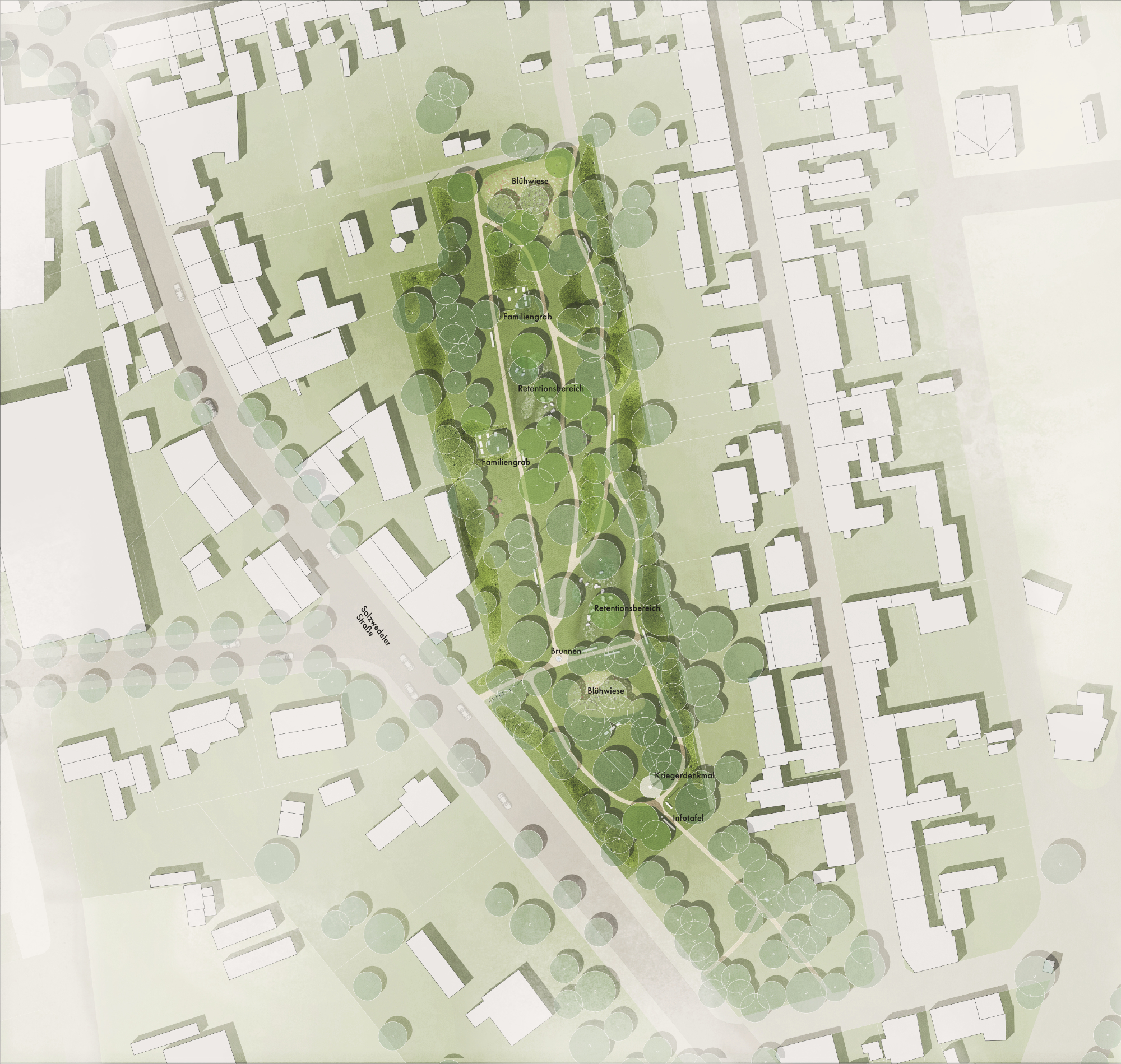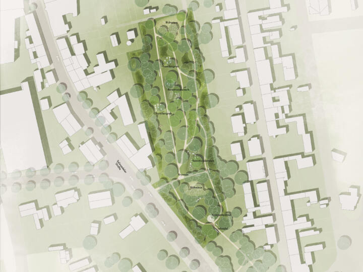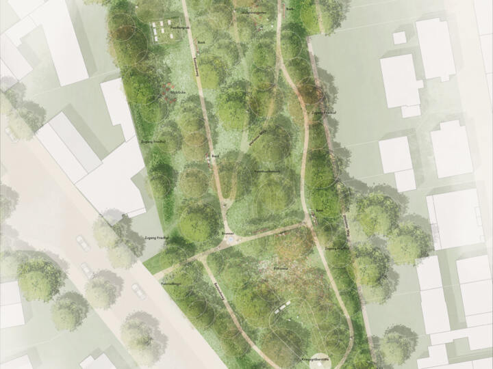 Die vorhandenen Wege, die entlang der alten Familiengräber und des Kriegerdenkmals verlaufen, wurden aufgewertet und barrierefrei ausgebaut. Ergänzende, untergeordnete Wegeverbindungen im Inneren des Areals schaffen neue Durchlässigkeit und betonen die Raumstruktur des Friedhofs. Zwischen den neuen Wegen entsteht ein kleiner Skulpturengarten, der eine weitere Ebene des Erlebens eröffnet und den Ort um eine künstlerische Dimension bereichert.