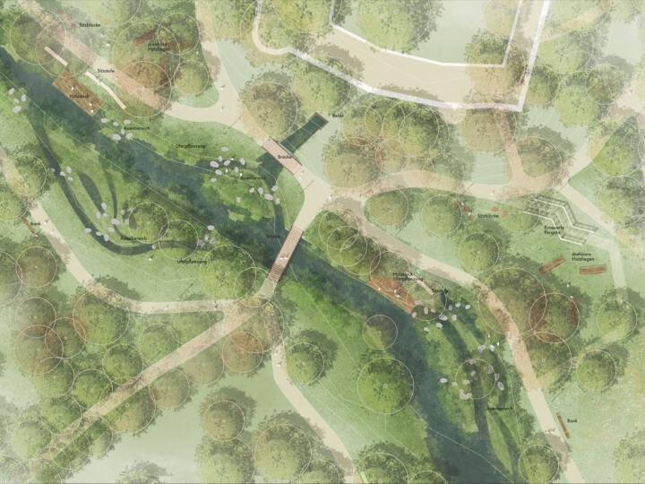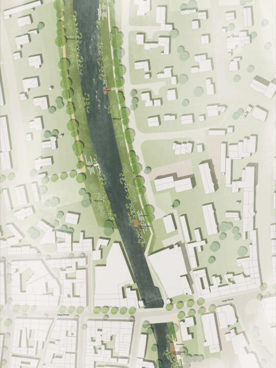 Die drei innerstädtischen Grünräume – Amtsgarten, Alter Friedhof und Jeetzelufer – bilden entlang der Langen Straße eine zusammenhängende Abfolge von Freiräumen, die Natur, Wasser und Ruhe mitten in Lüchow erfahrbar machen. Sie sind über ein durchgängiges, barrierefreies Wegesystem miteinander vernetzt, sodass Besucher:innen die unterschiedlichen Qualitäten der Bereiche gut erschließen können. Einheitliche Möblierung, Aufenthalts- und Ruhebereiche schaffen Orientierung und fördern die Aufenthaltsqualität, während die unterschiedlichen landschaftlichen Charaktere der drei Räume unterschiedliche Atmosphären vermitteln. Die Planung verbindet historische, soziale und ökologische Aspekte, stärkt die Identität der Innenstadt und bietet Orte für Begegnung, Erholung und Naherholung für alle Generationen.