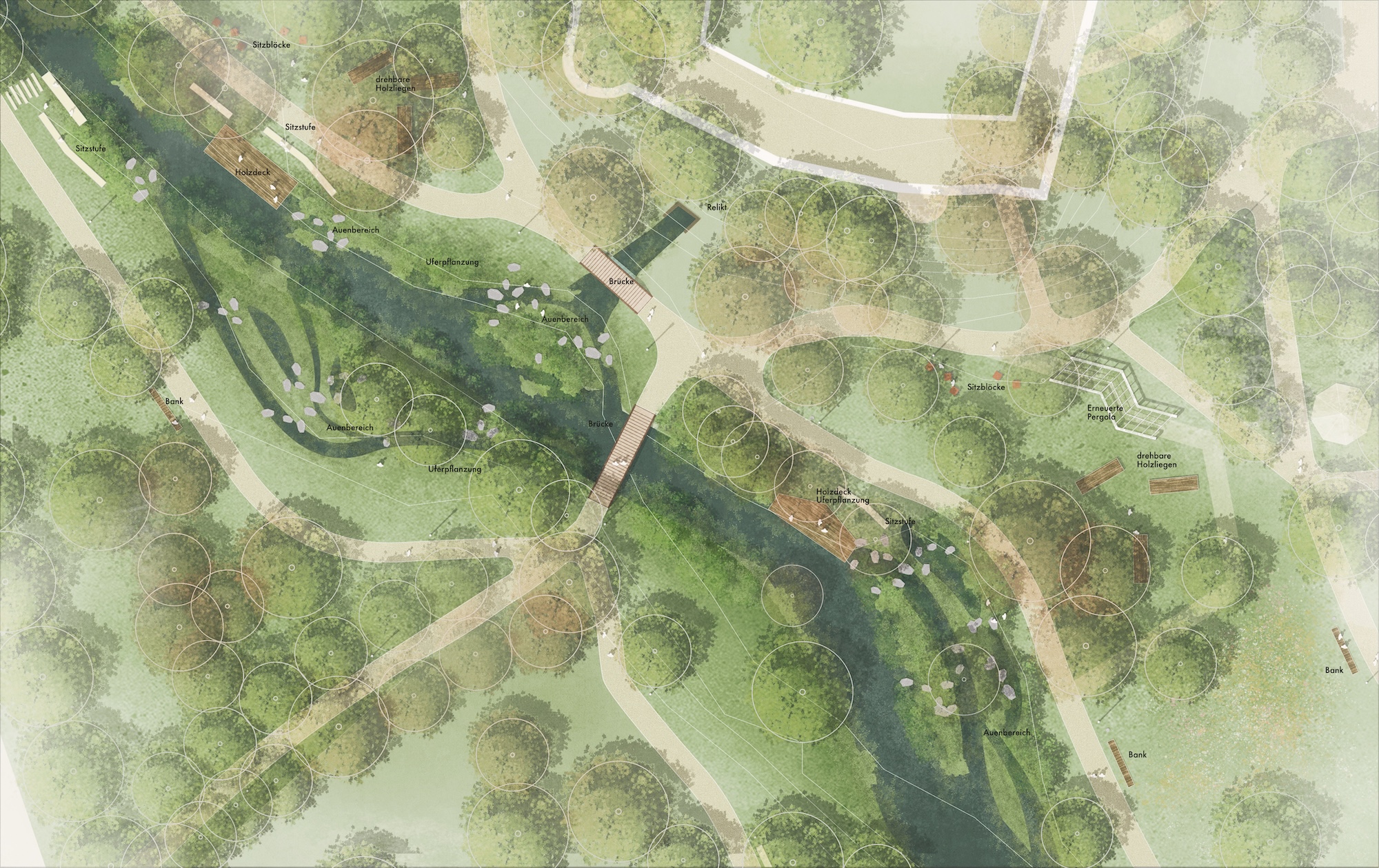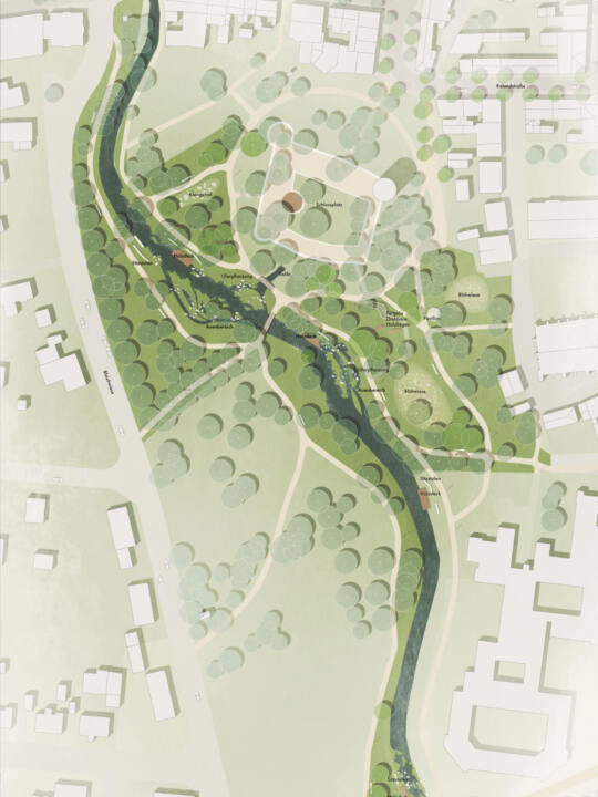 Durch die gezielte Abfolge der Grünräume entstehen sowohl klare Bezüge zwischen den einzelnen Bereichen als auch ein übergeordnetes städtisches Erlebnis. Die Integration naturnaher Gestaltungselemente, Bepflanzung und wasserbezogener Strukturen unterstützt die ökologische Funktion, stärkt die Biodiversität und trägt zu einer nachhaltigen, resilienten Innenstadt bei. So entsteht ein stimmiges Gesamtkonzept, das die Aufenthaltsqualität erhöht, verschiedene Nutzergruppen anspricht und die Innenstadt langfristig als identitätsstarken und lebendigen Stadtraum positioniert.
