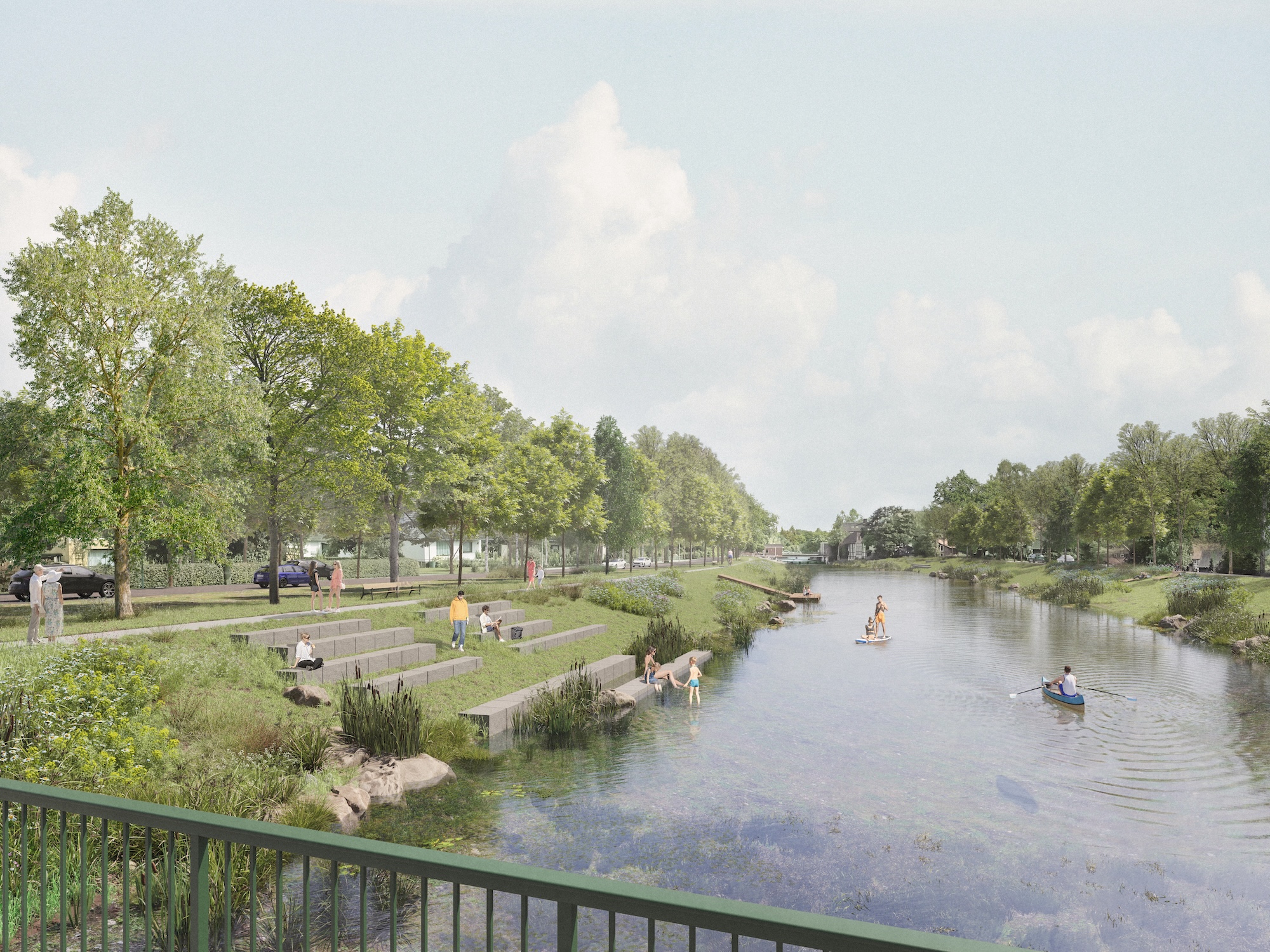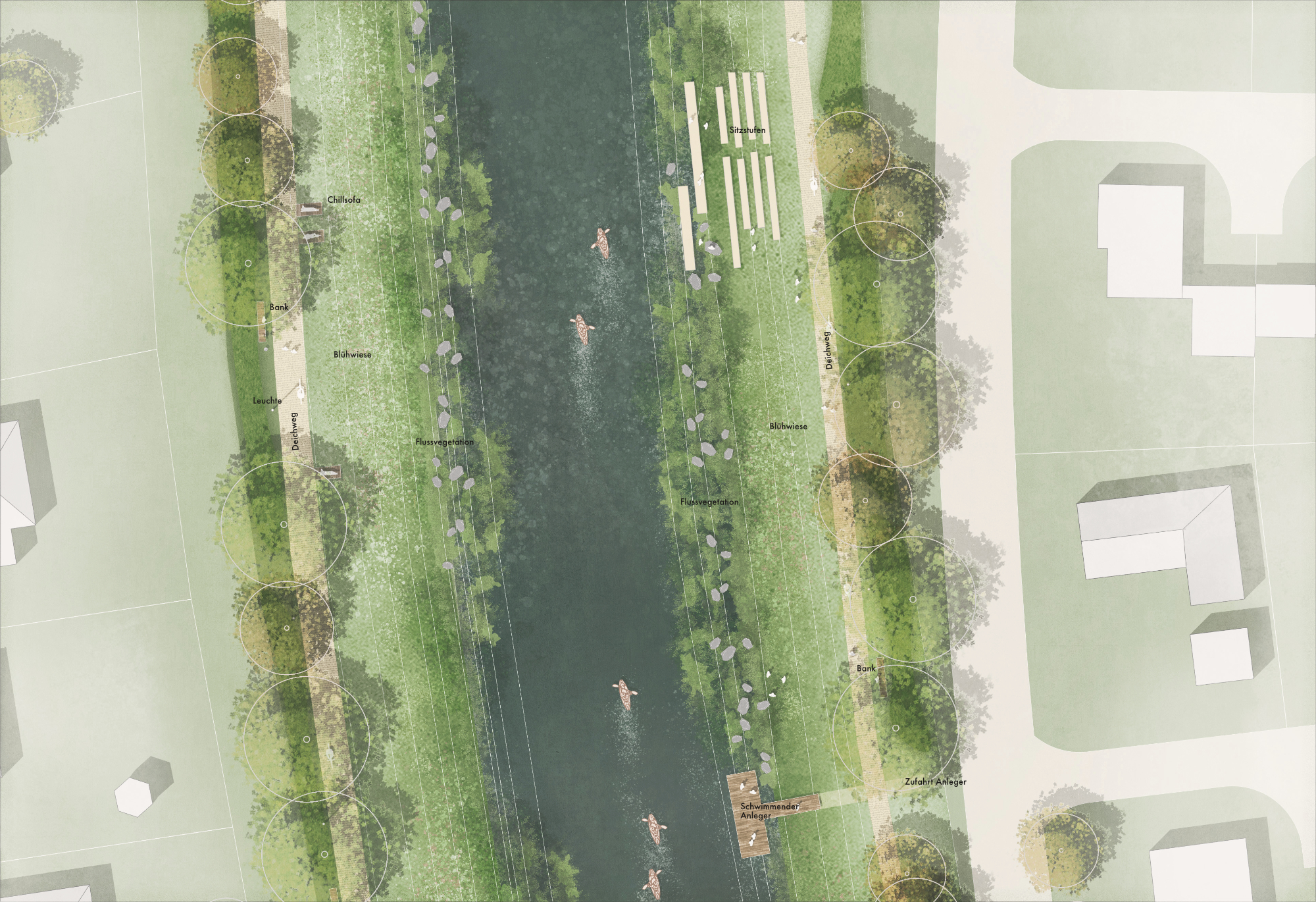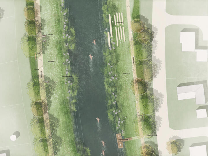 Entlang des Ufers wurden an mehreren Stellen Sitzstufen in die Böschung integriert und zum Teil schwimmende Holzdecks auf dem Wasser angelegt, die den Fluss unmittelbar erlebbar machen. Im nördlichen Bereich entsteht zudem ein Anlegesteg für Kanus und ähnliche Nutzungen, ergänzt durch eine sichere Zufahrt von der Straße „Am Deich“. Gerade der südliche Aufenthaltsbereich, auf der Seite des Altenheims, wurde barrierefrei zugänglich gestaltet, sodass Menschen aller Altersgruppen das Wasser über eine in die Böschung integrierte Rampe erreichen und genießen können.