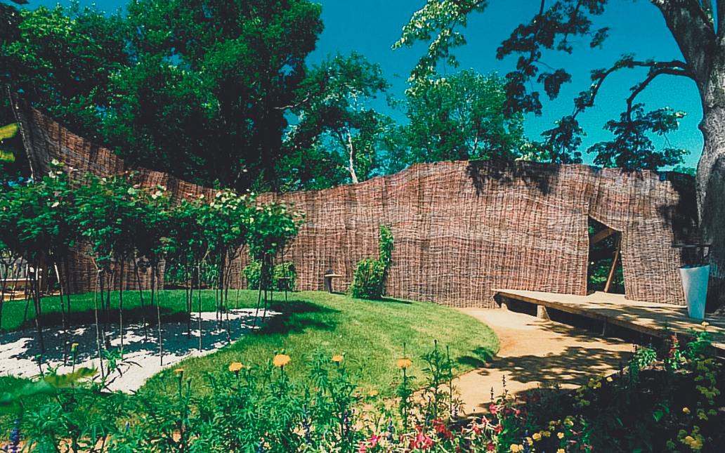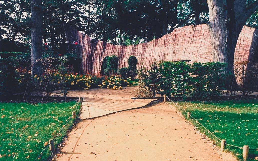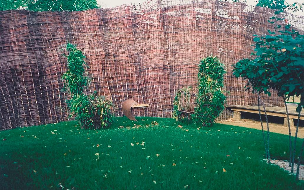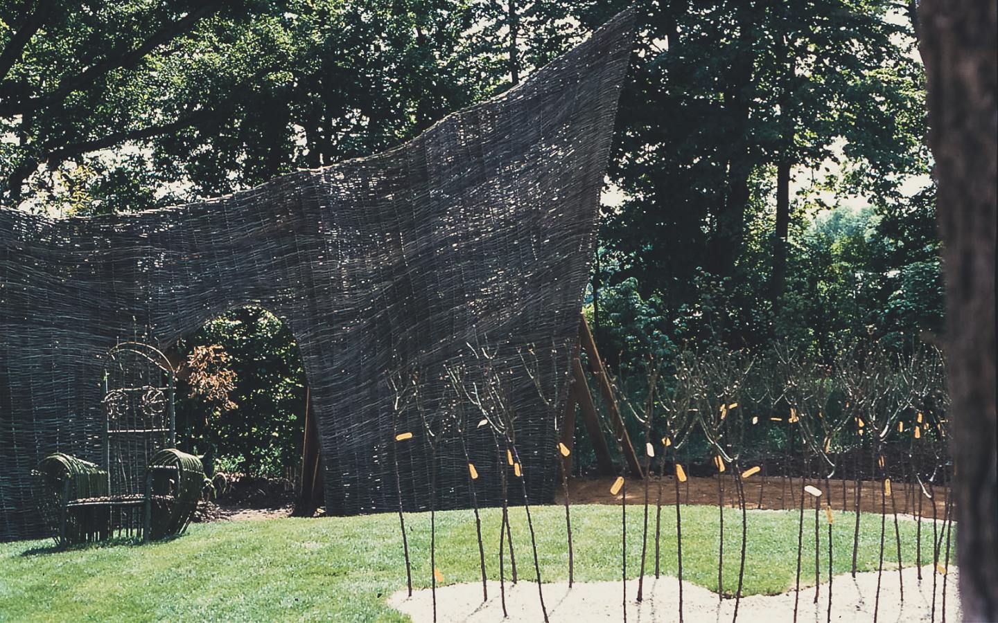 Wir erleben die freudige Überraschung des Kleinen Prinzen, der seine Rose liebt und pflegt. Dieser Moment aus Gefühl und Einsicht in die Dinge findet sich in dieser Garteninstallation wieder: Die zwei Liebenden, deren Blick abwechselnd voneinander zu den beiden Wolken aus roten Hochstammrosen schweift, leben in ihrem eigenen Paradies, einem sphärisch aufgeschütteten Rasenhügel mit zwei Sesseln aus lebendem Weidengeflecht.
