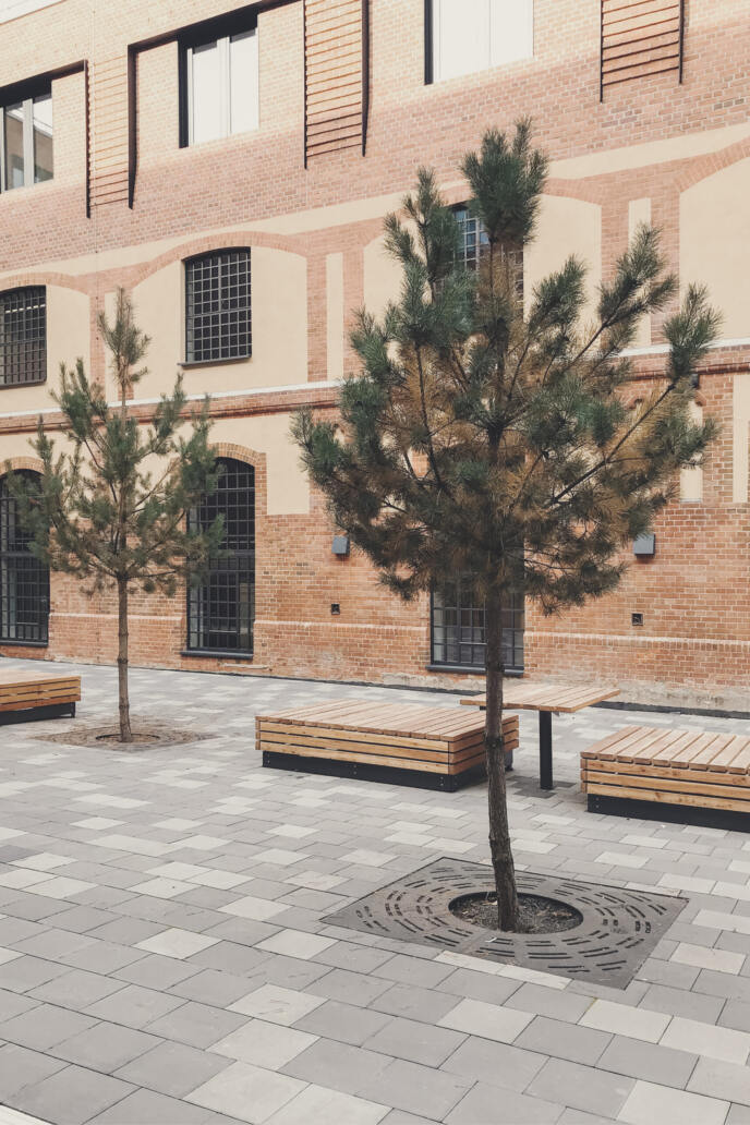 Die Außenanlagen der Hochschule in Fulda besitzen nach dem Umbau großzügige Möblierungselemente, die zum Lernen und Verweilen einladen. Die weitere Ausstattung besteht aus Natursteinpflaster, Blindenleitsystem mit Akkustikplatten, Arbeitsplätze aus Holzsitzbänken und Tischen als Sonderanfertigung, Fassaden- und Dachbegrünung, Bepflanzung aus Kiefer und eine grüne Borte aus Stauden und Gräsern. Die Spiegelelemente im kleinen Innenhof als Kunst am Bau von Franz Erhard Walther ergänzen die Atmosphäre.