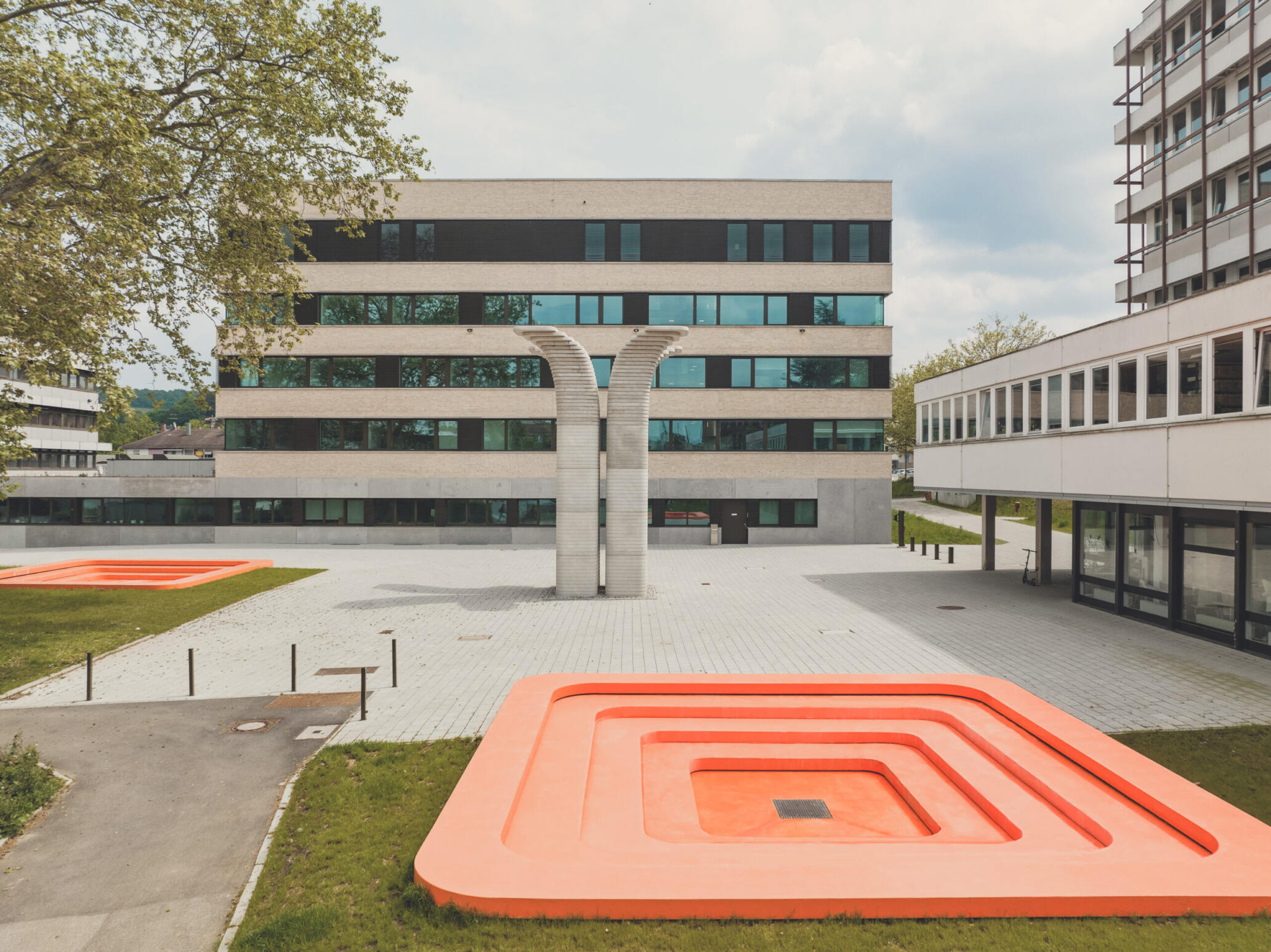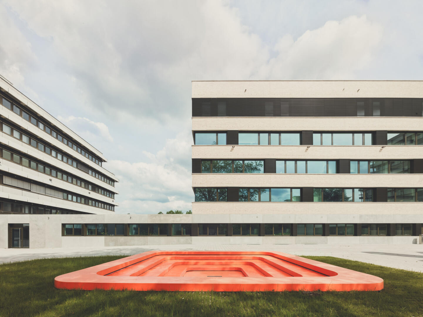 Eine zentrale Rasenfläche nimmt das künstlerische Konzept von Thomas Lenk auf, befestigte Flächen und Grünflächen mit den beiden Wasserbecken zu verschneiden und minimiert gleichzeitig den Anteil an versiegelten Flächen.