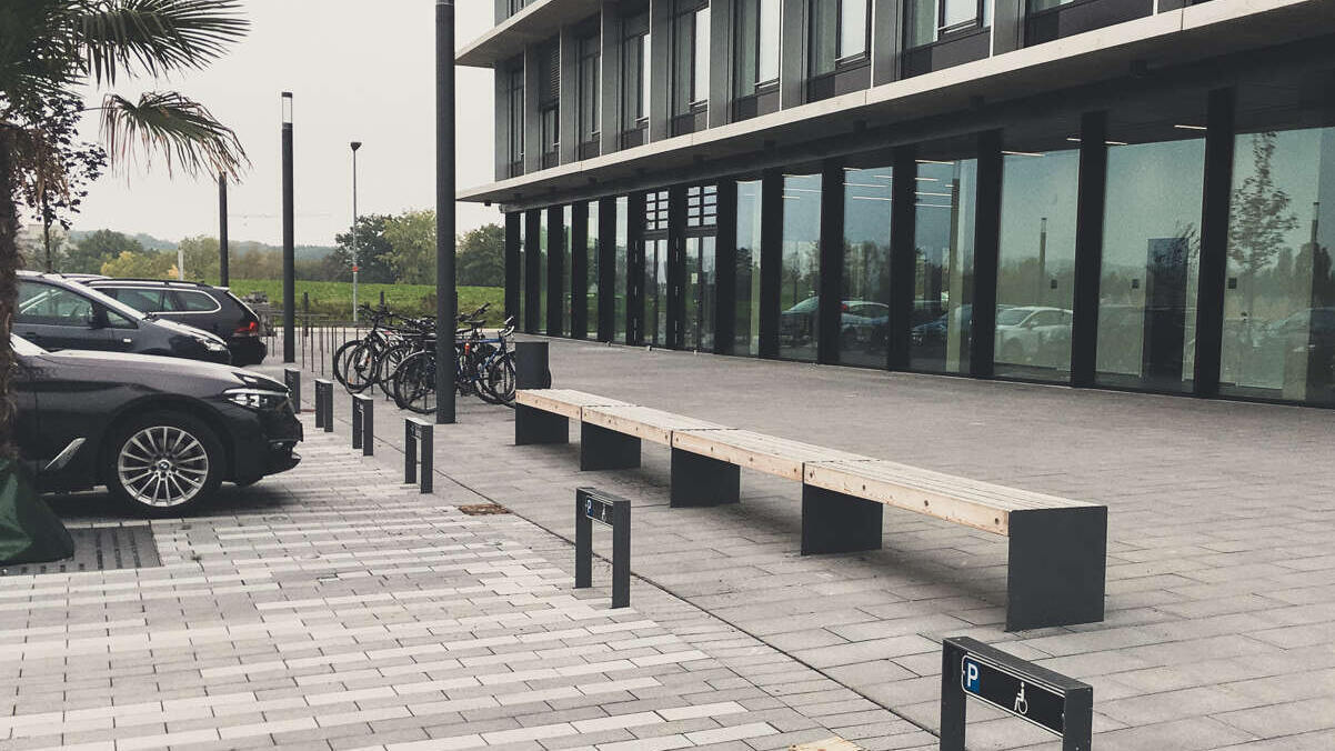 baumüberstandenen Mittelpunkt und Treffpunkt für Mitarbeiter der angrenzenden Institute. Mittels Materialwechsel wird dieser zentrale Ort als Intarsie inmitten der umliegenden Fahrwege ausgebildet. Der Platzcharakter wird durch großkronige, im Raster gepflanzte Bäume unterstützt (Kunst am Bau).