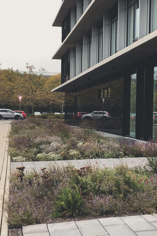 Die Dachflächen des Institutes und des Außenlagers werden mit einer extensiven Dachbegrünung angelegt. Diese Begrünung unterstützt das Mikroklima des Ortes und sorgt für die Nutzer der Dachterrasse im Sommer für Kühlung. Zudem führt eine vielfältige Bepflanzung zu einer visuellen Aufwertung der Aufenthalts- und