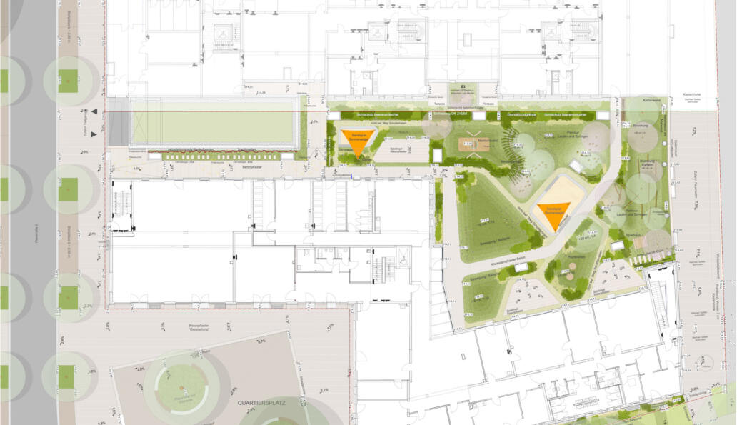 Das Projekt beinhaltet die Gestaltung der Freianlage von Mehrfamilienhäusern (Punkthäusern) und dem Z-Gebäude mit Kita und Gewerbe auf einer Tiefgarage, sowie einem anliegenden Quartiersplatz.