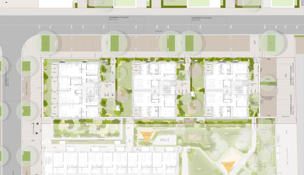 Die privaten Gärten werden flächig mit einer Wildblumenwiese oder einem Kräuterrasen angelegt. Seitlich begrenzt werden die Gärten von Laubhecken gerahmt von artenreicher gestaffelter Bepflanzung aus Bodendeckern, Gräsern und Stauden. Die Grünflächen um die Wohnbauten erhalten leichte Retentionsmulden.