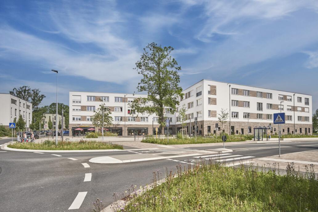 Mit einem öffentlichen Platz ist ein attraktiver Eingangsbereich für das Quartier geschaffen worden. Pflanzflächen, in die Sitzgelegenheiten integriert wurden, schaffen hier Aufenthaltsqualität und erhöhen durch artenreiche Bepflanzung die Biodiversität.