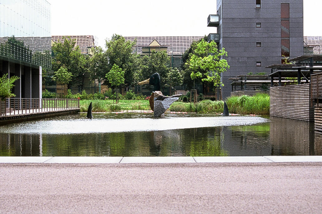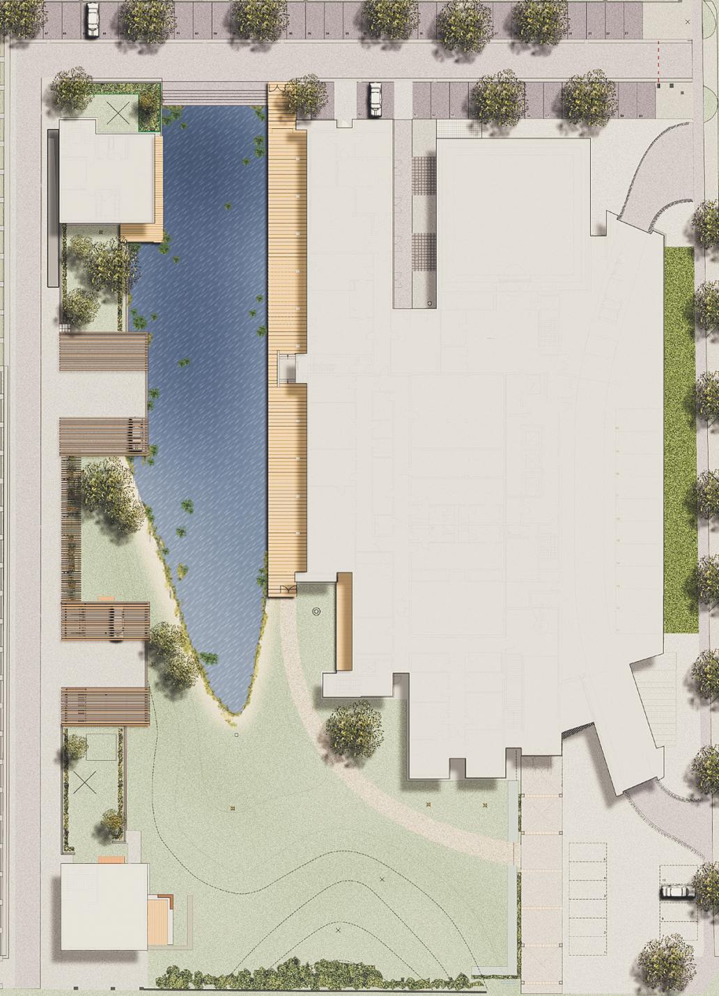 Mit dem Ziel, die „Grüne Lunge“ im Süden von Halle zu stärken, entstand ein ökologisch-gestalterisches Gesamtkonzept, das den im Süd- Friedhof bereits gestalteten Landschaftsraum bis zur Damaschkestraße ausweitet, notwendige bauliche Maßnahmen wie die Regenrückhaltung integriert und gleichzeitig mit der Idee des Parks das Umfeld von Wohnen und Arbeiten aufwertet. So ent- stand auf dem Gelände des Schießstandes der ehemaligen Kaserne eine hochwertige Gartenanlage mit drei sich klar voneinander abzeichnenden Bereichen.