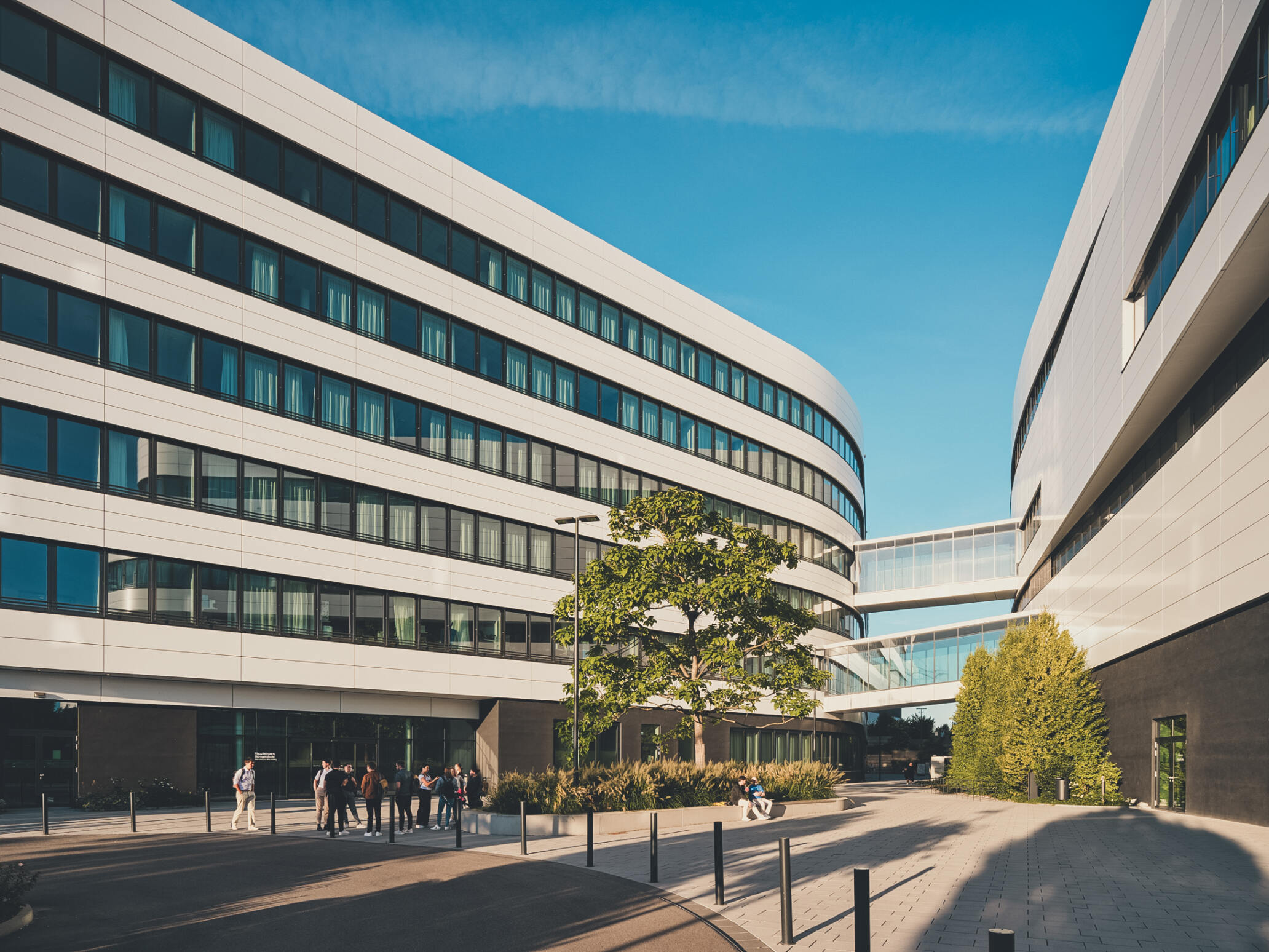 Entlang der Gebäudefassade der Halle flankieren Hainbuchensäulen und Pflanzflächen, deren Form sich an die wiederkehrenden Gebäudeformen anlehnen und den Entwurf abrunden. Die „Grüne Treppe“ stellt eine optische Verbindung zwischen Bürogebäude und Halle dar. Sie ist eine Hauptverbindung zur großzügigen Dachbegrünungsfläche mit anschließendem Zugang zum Parkhaus. Neben der Funktionalität der Überwindung des Höhenversprungs soll die Treppe dem Aufenthalt und Verweilen dienen. Die Treppenanlage erhielt Sitzstufen mit Holzauflagen sowie waagerecht liegende und durch Stützmauern abgefangene Baumstandorte mit Unterpflanzungen, wodurch eine abwechslungsreiche Fußgänger*innenführung entsteht. Diese leitet durch Verweilnischen und es entsteht ein einladender Aufenthaltscharakter.