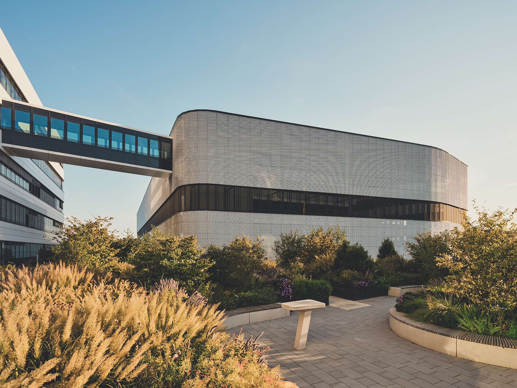 Der Verbindungsbau erhielt eine großzügige Dachbegrünungsfläche, mit raumbildenden Großsträuchern. Die Dachbegrünung wurde mit schirmförmig überhängenden Solitärbäumen sowie einer ca. 60-100 cm hohen abwechslungsreichen Gräser-/ Staudenbepflanzung einschließlich eingestreuten Sträuchern bepflanzt. Diese stehen in einer abwechslungsreichen Gräser- und Staudenbepflanzung. Die Dachfläche wurde zusätzlich mit zwei ca. 45 cm tiefer liegenden Terrassen ausgestattet, auf denen die Belegschaft ihre Pausen verbringen kann. Als Sitzgelegenheiten wurden innerhalb der Stahleinfassung den Rundungen der Terrassenform folgende Betonsitzkuben mit Holz-Sitzauflage integriert. Die Zugänglichkeit zu den Terrassen sowie die fußläufige Verbindung zwischen den Terrassen wird durch Sichtbetonrampen hergestellt.